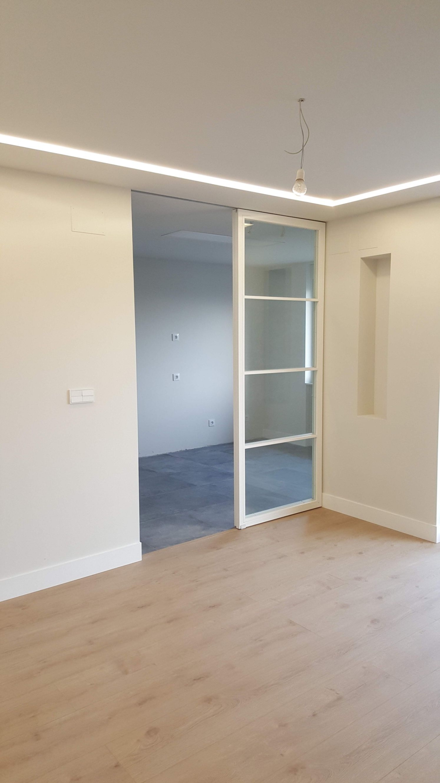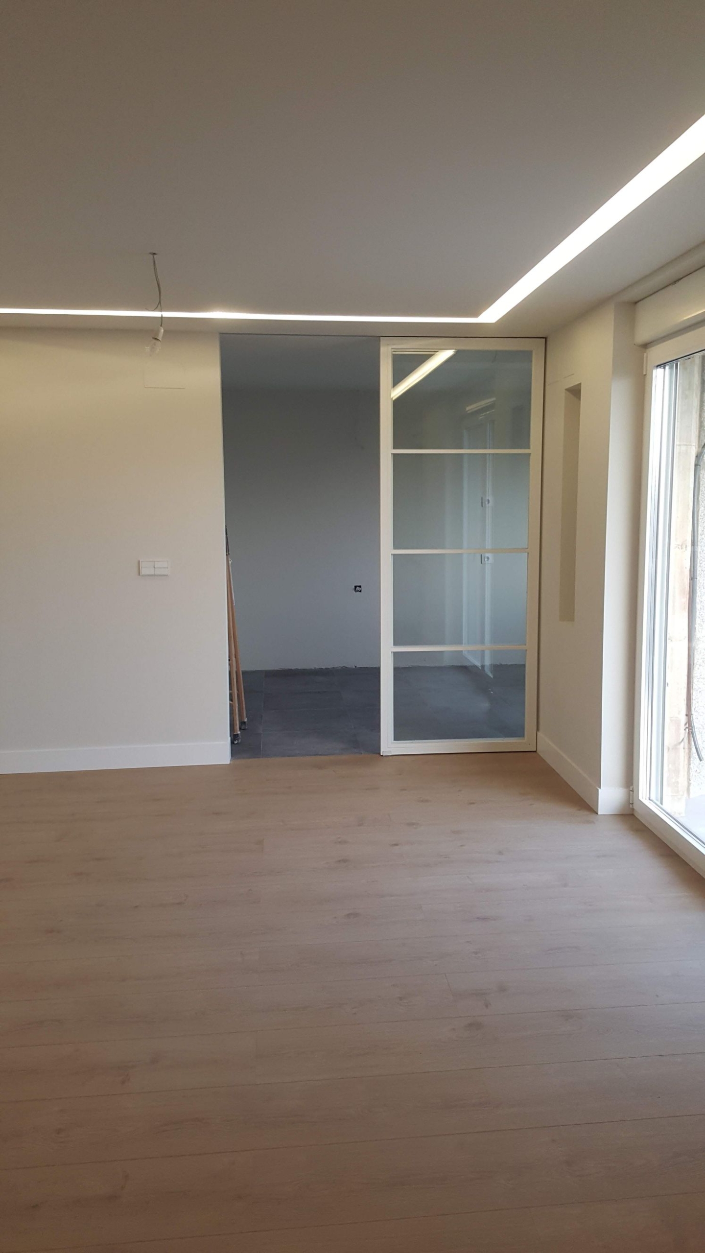 Después de sustituir el tabique por un cerramiento de dos hojas en blanco conseguimos ganar luz y disfrutar de una conexión visual y un paso más cómodo hacia el comedor, pudiendo aislar el salón cuando sea necesario para evitar olores o ruidos.